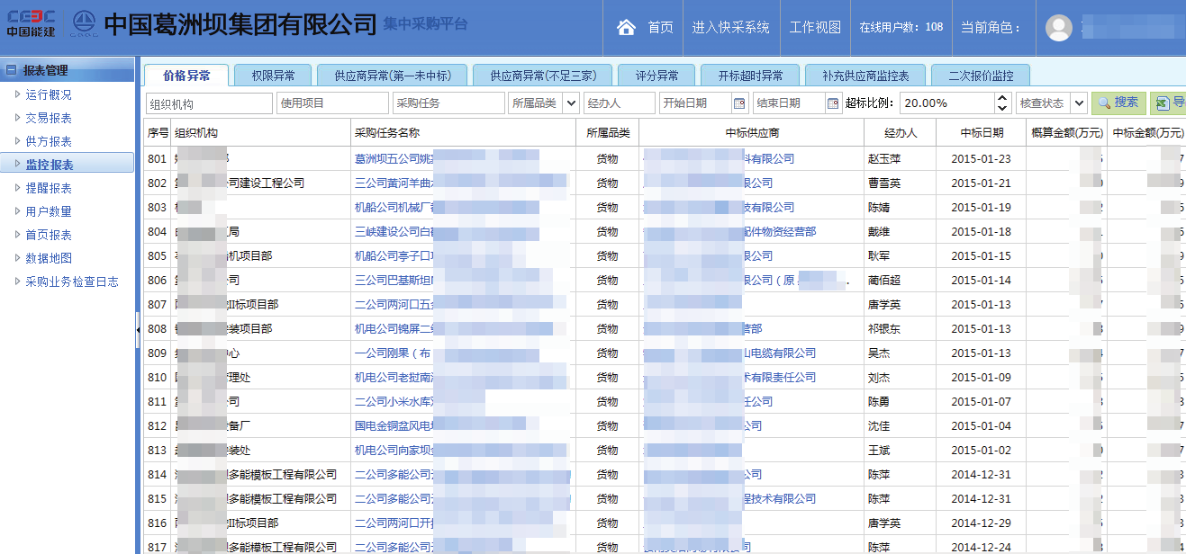 2013 年 10 月进行试用版本应用。初步建立网上在线招标工作模式。2014 年 10 月进行正式标准版本应用。修订试用版本期间的应用模式,并加强供应商管理以及在线评标模块的应用。2015年 12 月进行签署定制化升级维护协议。主要涉及平台首页改造、平台的本地部署、微信端应用、PPP 分包商专项模块、营改增政策适应等方面。2016 年 3 月完成系统本地部署。2016 年 6 月微信端公众号及在线审批上线。2016 年 7 月专业化监督提醒模块上线。截止 2017 年 5 月,集团内部注册用户 6200 余人,葛洲坝所属单位线上招标累计完成 18000 余次,供应商总量 4万余家,每年上线涉及金额约 400 亿元。