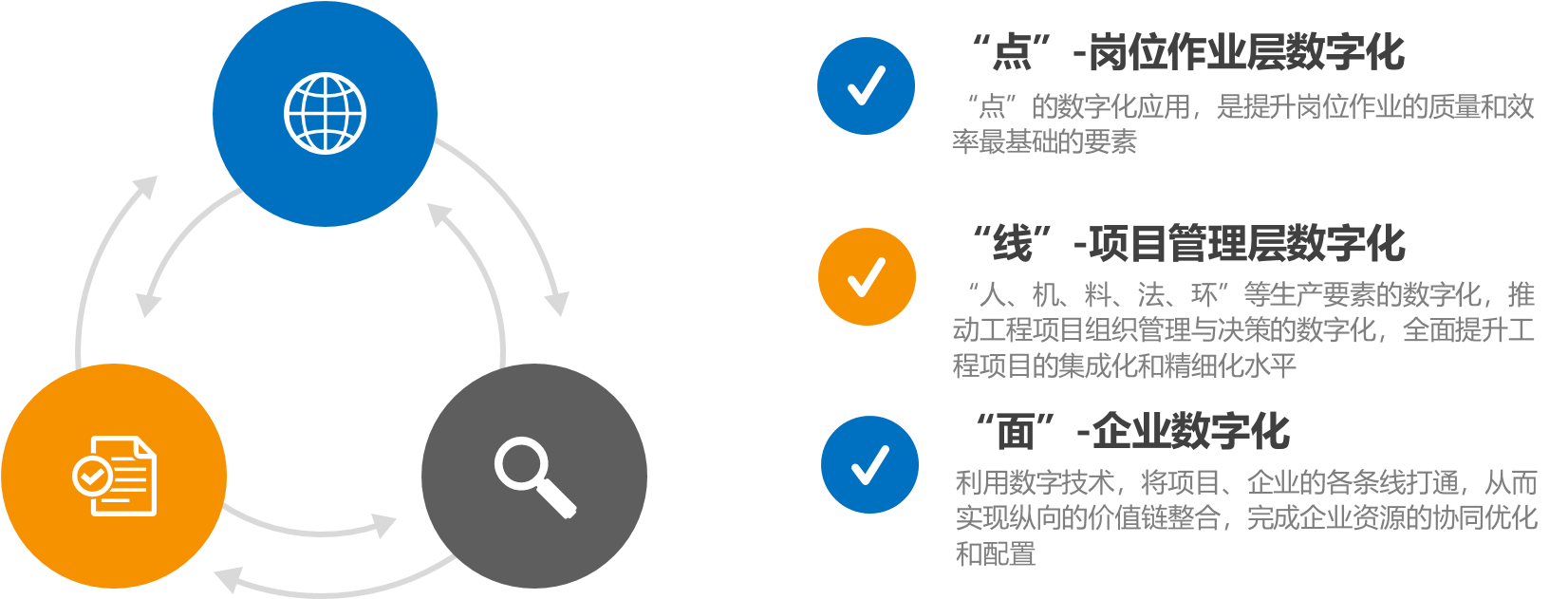 以安全管理数字化为切入点,在一个项目上试点先行;试点成功后,将安全数字化管理推广到所有项目,再逐步应用到劳务、质量、生产、技术等其他模块,实现项目管理层数字化;利用数字技术,建立起总公司-公司-项目的三级管控平台,将项目、企业的各条线打通,从而实现纵向的价值链整合,完成企业资源的协同优化和配置,实现企业的数字化全面转型。