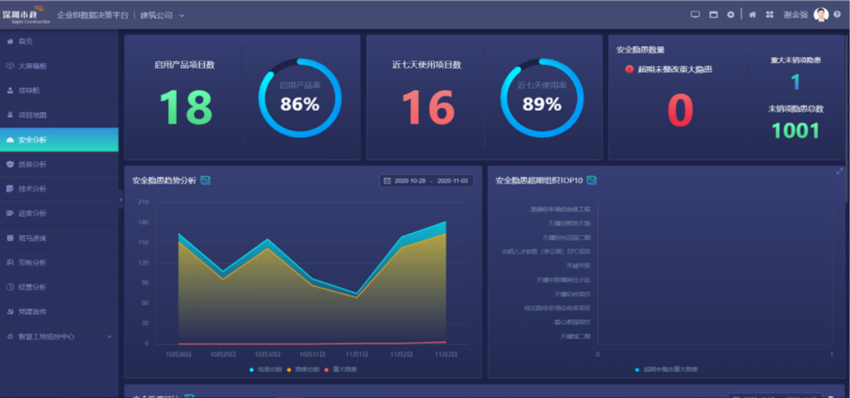 在应用成果显著后,逐步在其他项目上进行推广应用,截至2020年8月,实现所有18个在建项目安全管理模块100%全覆盖。并建立了“总公司-公司-项目三级管控体系,有效地对安全工作进行全面监管。日常通过企业BI实时抓取现场数据,并对数据进行归纳、总结、分析,以图表形式反馈业务状态。例如安全问题复现率的统计能够使公司领导迅速了解某个项目安全问题管理重点。