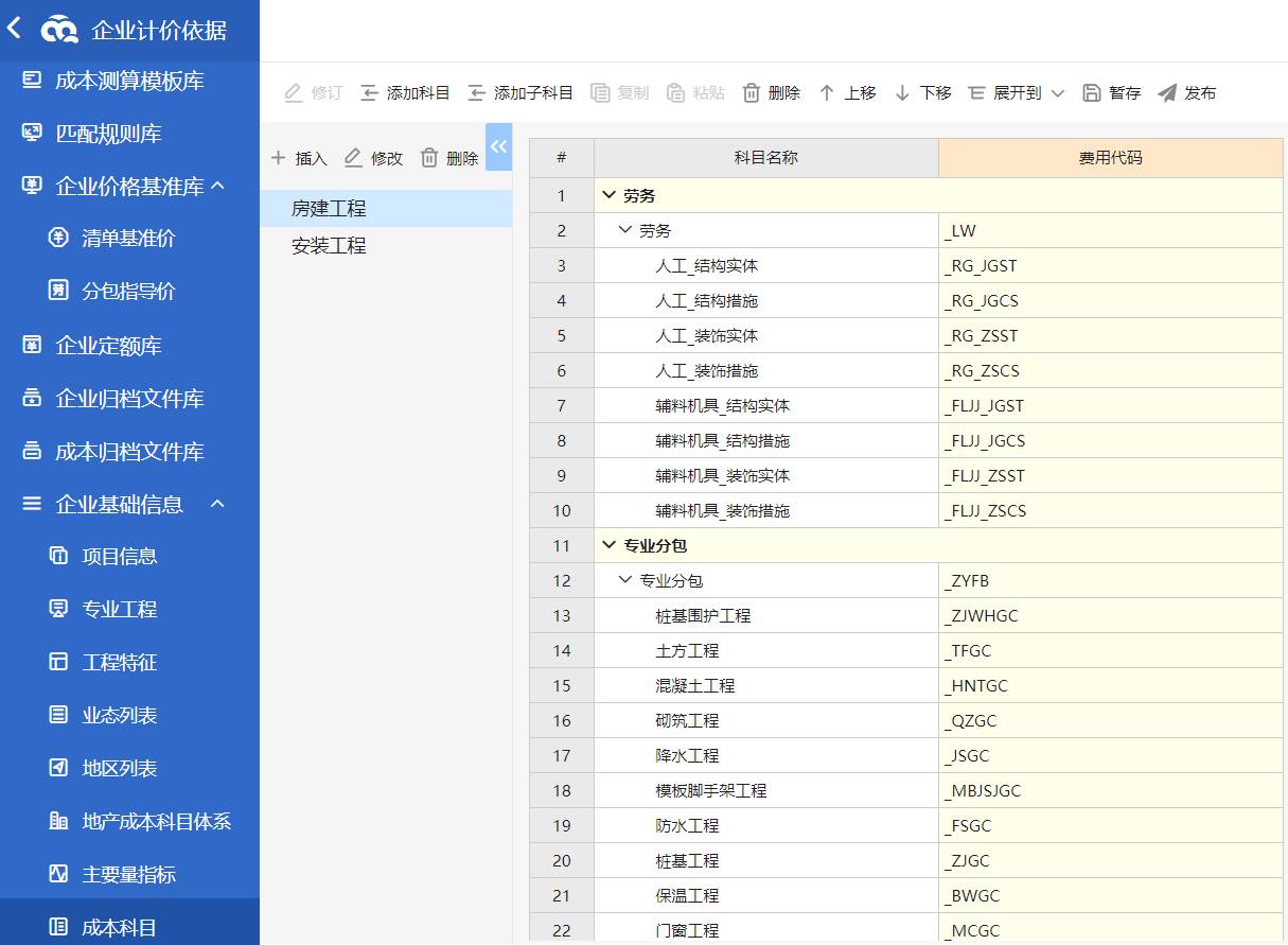 企业可以根据项目的实际情况,灵活高效的设置成本科目,后期可供企业共享使用。