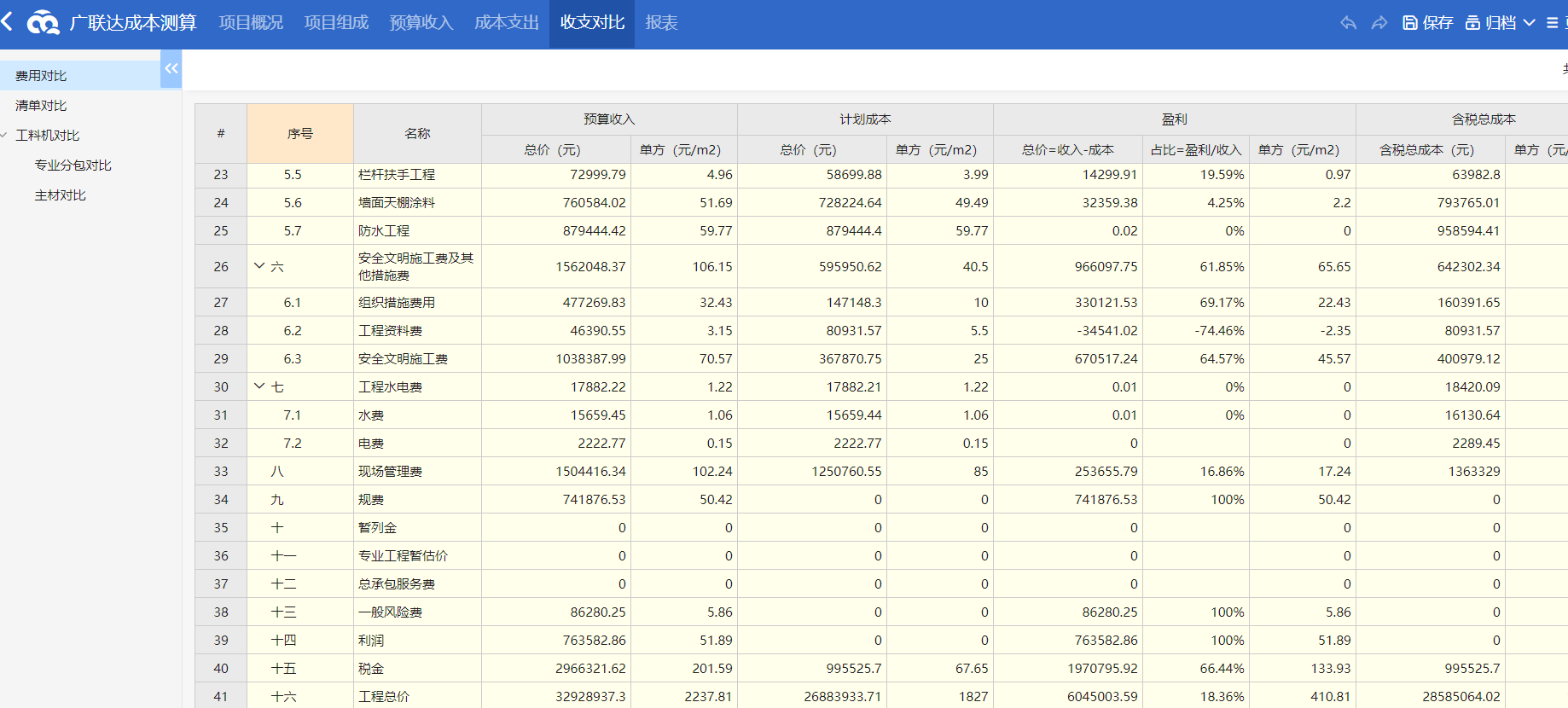 根据成本科目自动提取预算收入和支出成本进行盈亏分析;支出逐条清单对比成本价与预算价,分析盈亏情况。将企业分包数据在线存储,成本测算流程标准化、规范化,让企业内部即使是新人也能掌握成本测算的基础能力并且减轻后续审核工作量。