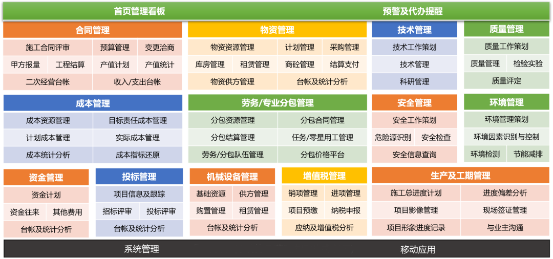 建立并规范项目管理知识体系,包括合同、成本、安全、进度、质量等,提升项目管理规范化,降低多项目管控风险,同时,通过智慧工地系统,实现对项目过程动态化、精细化以及可追溯的管理目标。
