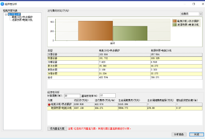 经济性分析结束后自动生成表格,对比两个方案的初投资费用、运行费用,计算生命周期费用可见:方案1地源热泵+电制冷机方案的初投资比方案2电制冷机+热水锅炉方案多1148万元,会增加投资回收周期9.87年,但是方案1运行费用低,综合经济性能较好,更加的节约能源、绿色环保,长期考虑可以选择方案1。