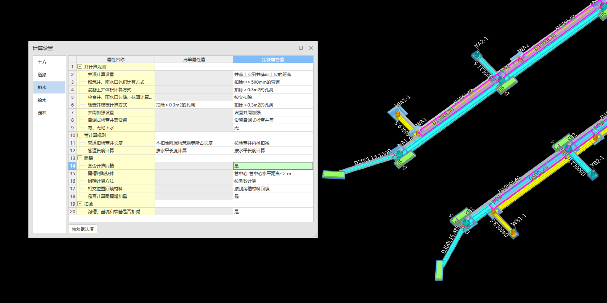 根据井、管一键快速布置基坑、沟槽三维模型,支持多级 沟槽、多层回填设置,自动扣减路基、井管等占位体积, 精准计算管网土方工程量。