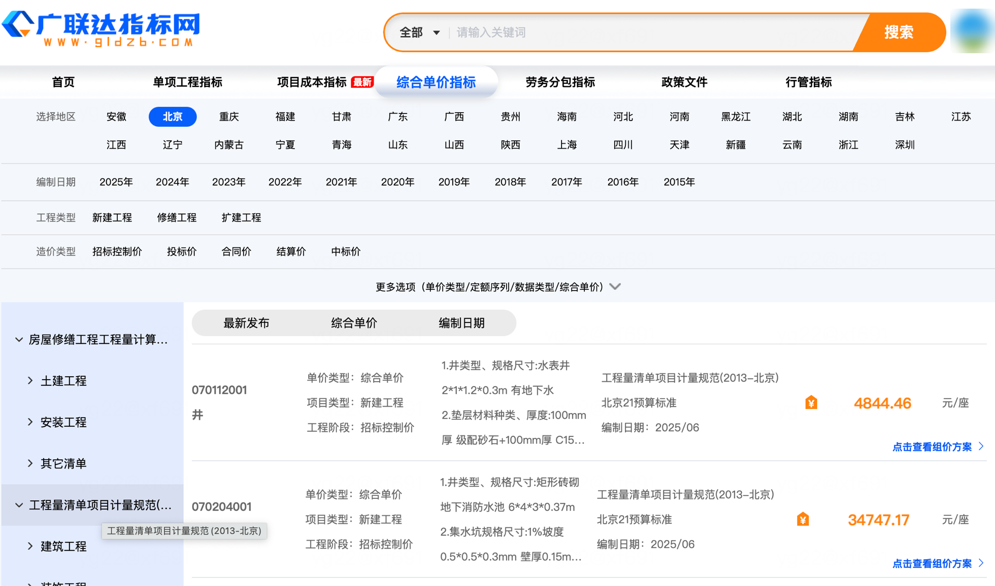 综合单价指标提供海量真实项目清单组价方案、综合单价,云计价直接调用,大幅提升清单编制、组价效率;涵盖信息:清单名称、特征描述、综合单价、编制日期、工程阶段、定额组成、单价构成、工料机价格等。