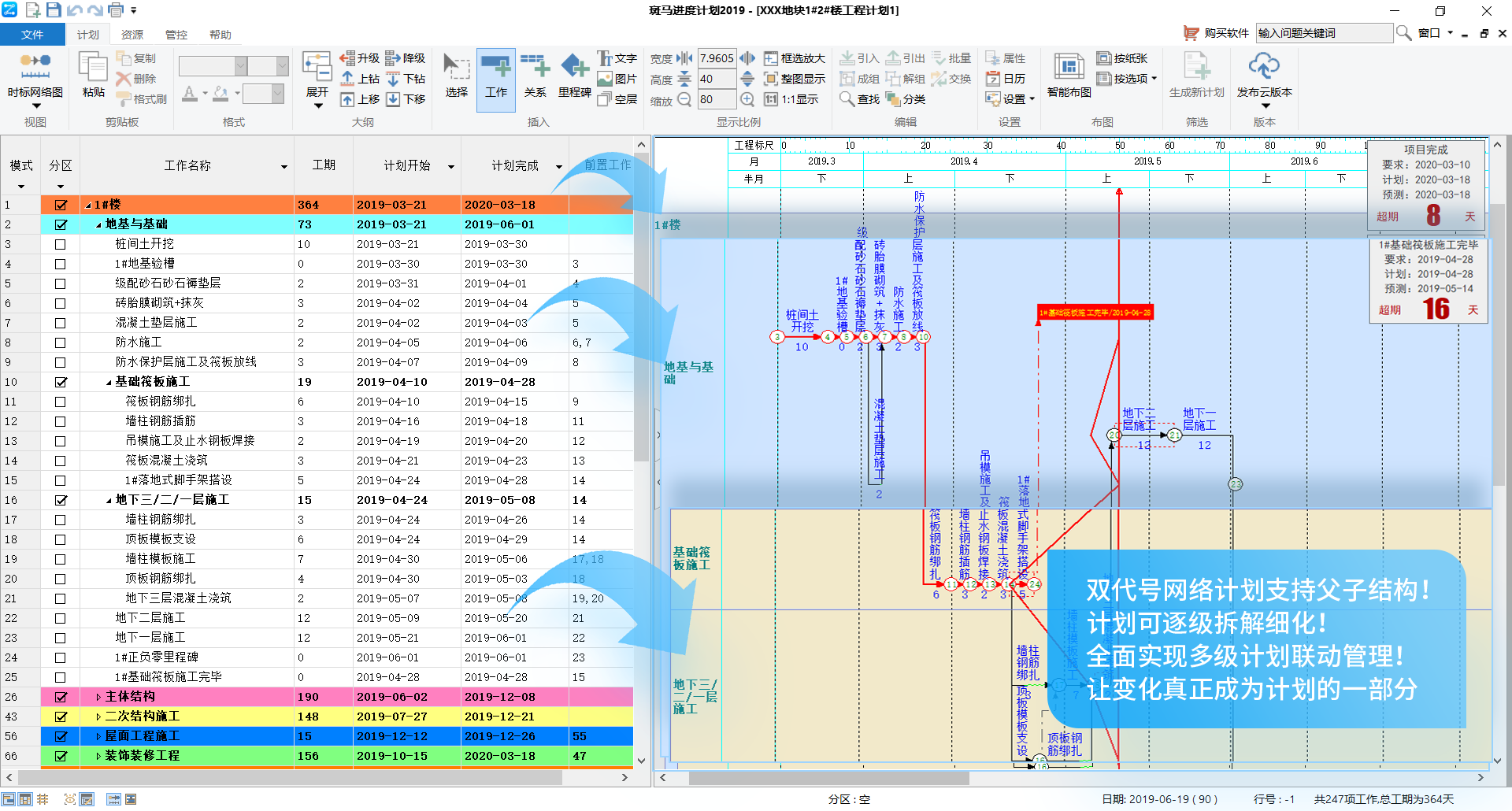 全新形象进度计划横轴依然是时间轴,但纵轴添加了空间的业务涵义,横看看一层、纵看看一栋、斜看看一类;投标时,真实反映您高超的管理水平和技术创新能力!施工时,是给领导汇报和队伍交底的好帮手!