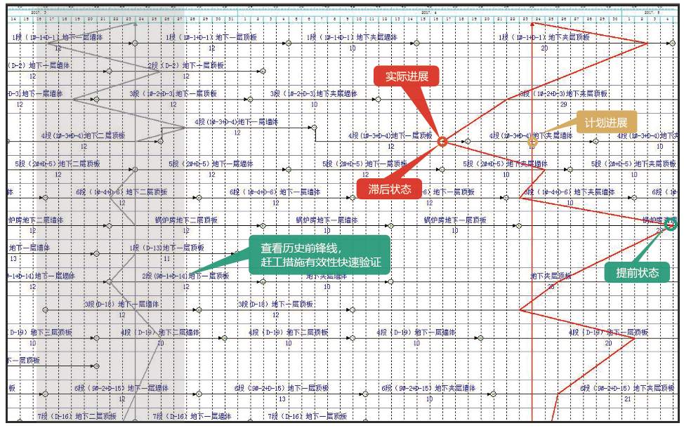前锋线直观、全面反映计划与实际的差异,作业性计划的执行情况对上级控制性计划的具体影响也可以直观看出,方便项目及时发现进度提前和滞后偏差,分析原因,进而采取纠偏措施!