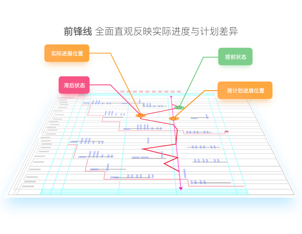 前锋线全面直观反映实际进度与计划差异前锋线全面直观反映实际进度与计划差异 及时准确预警风险,指导纠偏,提供索赔依据 |