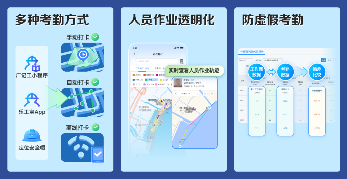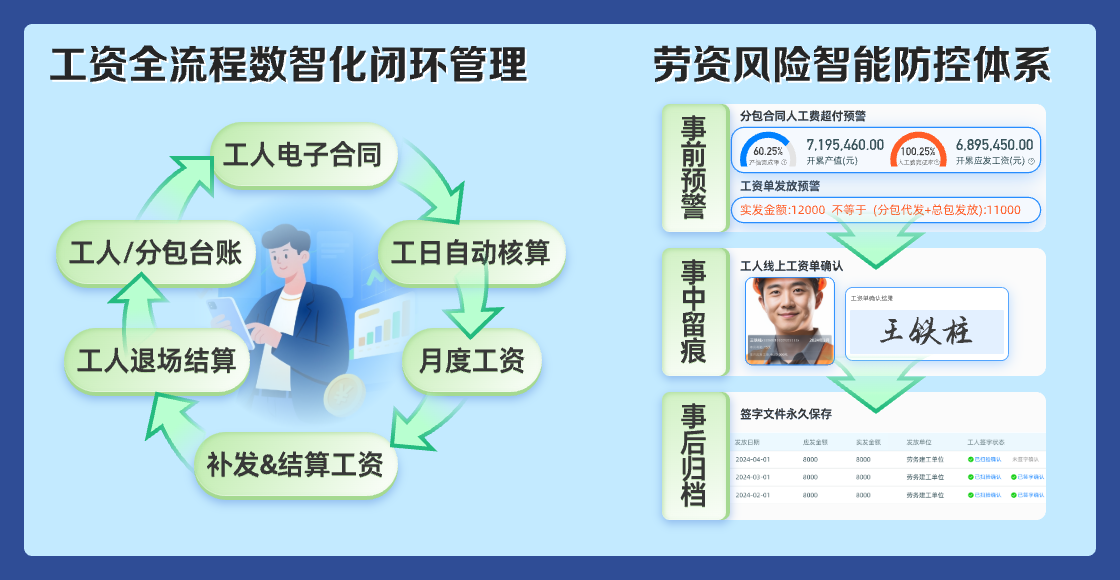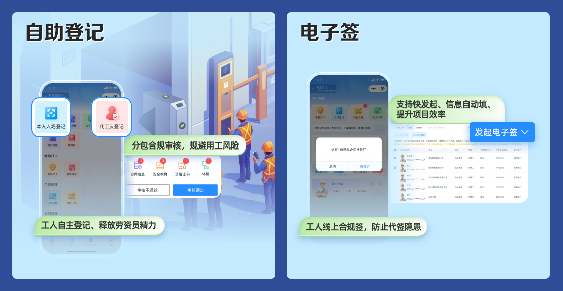 移动端自助登记 破解工人批量进场登记与风险防控痛点,支持小程序远程预登记 + 合规审核(三级教育 + 实名无风险),提效降隐患,助企业规范用工 电子签 数字化管理工人进、退场资料签署,项目便捷发起、工人小程序远程签,保本人签署合法,助项企管控,解代签、盖章慢、归档难问题 |